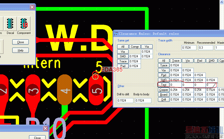 2.然后我在DRC的clearance里面将与TEXT有关的间距要求全部改为了0(见图中红圈所示),但涛声依旧呀!还是DRC显示报错!