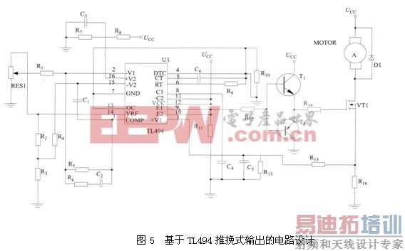 该控制系统的具体实现电路如图5所示。系统功率驱动选用MOSFET,其输入阻抗很高,可直接由晶体三极管驱动。TL494的13脚用来控制输出模式。在该系统中,选择将该端输入为低电平,这时TL494内触发器Q1和Q2不起作用,两路输出相同,其频率和振荡器频率相同、最大占空比为98%。