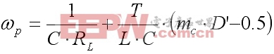 第四项包含两个位于开关频率一半处的极点。这些极点的峰值受阻尼因子Qp控制,而阻尼因子又进一步受校正斜坡控制。如果斜坡太小,这些极点将使调节器的环路增益到达最高点,如果占空比大于50%,在一半开关频率处的环路增益将超过0dB。这将导致电流模式控制发生次谐波振荡。