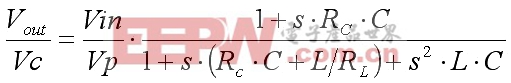 调制器和功率级的增益直接跟随输入电压(Vin)的增加而增加。和频率相关的项是LC网络的传输函数。该网络具有电感和输出电容所引入的双重极点,同时还具有一个零点,该零点由输出电容C和它的ESR造成。