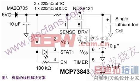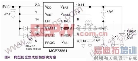 基于Microchip MCP73861的全集成线性解决方案如图4所示。MCP73861包含了MCP73843的所有功能,另外还包括电流检测、传输晶体管、反向放电保护以及电池温度监测。