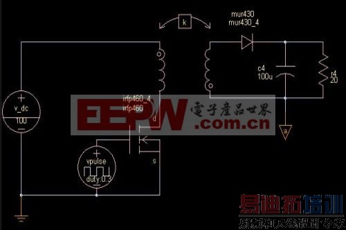下面先让我们仿真一下反激flyback电路的工作过程。在使用耦合电感仿真的时候,我们需要知道saber中,耦合电感怎么用。简单的办法,就是选择一个理想的线性变压器,然后设置其电感量来仿真。还有一个办法,就是利用耦合电感K这个模型来仿真。下图是我们用来仿真的电路图,为了让大家能看到元件参数的设置,我把所有元件的关键参数都显示出来了。还有,因为仿真的需要,我把输入和输出共地,实际电路当然是隔离的。