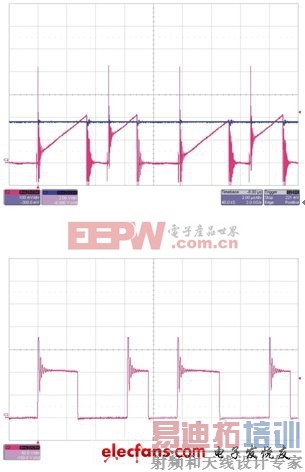 利用控制 IC 中的上升边沿消隐可以很好地解决这一问题,其忽略了电流波形的最初部分。波形的高频滤波也有助于解决该问题。同样也要将电容器尽可能近地靠近控制 IC 放置。正如这两种波形表现出来的那样,另一种常见的问题是次谐波振荡。这种宽-窄驱动波形表现为非充分斜率补偿。向当前斜坡增加更多的电压斜坡便可以解决该问题。