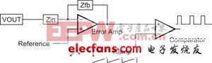 图 1 显示的是电源内部一些主要噪声敏感型电路的结构图。将输出电压与一个参考电压进行比较以生成一个误差信号,然后再将该信号与一个斜坡相比较,以生成一个用于驱动功率级的 PWM(脉宽调制)信号。
