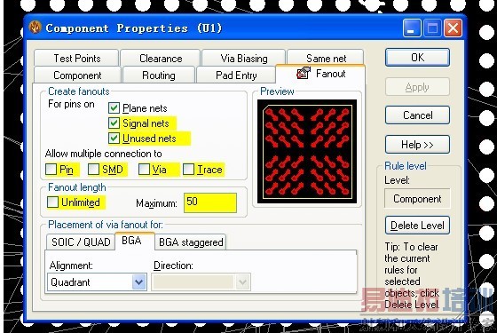 如上图所示Via全部出现在BGA的pad上面下图是fanout设置求高人解疑!谢谢了在、!1