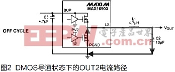 MAX16903同步DC-DC转换器的开关电流通路需要3个无源元件(C2、C3、L1),这三个元件对电磁辐射和器件性能的影响非常大。图1、图2给出了ON、OFF周期的电流路径;图3说明了出现最高di/dt的两个电流路径的差异。应优先考虑C3的布线,其次是L1和C2的布线。
