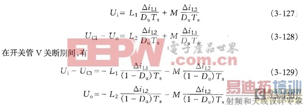 假设Cuk转换器在电流连续的状态下工作,如果不计损耗则在开关管V导通期间下式成立: