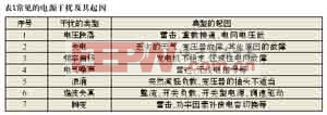 造成电源干扰复杂性的第二个原因是干扰表现的形式很多,从持续期很短的尖峰干扰直至电网完全失电,其中也包括了电压的变化(如电压跌落、浪涌和中断)、频率变化、波形失真(包括电压和电流的)、持续噪声或杂波,以及瞬变等。我们根据国内外的抗扰度测试的一系列标准和实际应用中常常出现的问题,总结了电源干扰的常见起因,如表1所示。