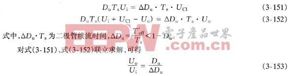 式中,△iD为二极管电流在开关管V导通或关断期间的变化率;ID为二极管导通时的电流平均值,见式(3-147)。电流连续时,流过二极管D的电流波形为梯形波,故§1.电流临界连续时,iD为底宽(1-Du)Ts的三角波,§=1。电流不连续时,iD为底宽进一步减小,故§=1。因此,§=1就是电流连续与断续的边界。