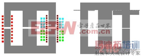 在图中我们看到转换后绕组所占总体积减小,而且平面导体布置结构更紧凑,每根平面导体厚0.2mm,十二层平面导体的厚度为2.4mm,即使加上绝缘层厚度,与E42/21/20磁芯的窗高(窗高29.6mm,窗宽8.65mm)相比也是很小的,这使得EE磁芯的窗口利用率明显下降。而且使用EE磁芯,也不利于降低磁件的高度,下面研究把EE磁芯转换成EI磁芯。
