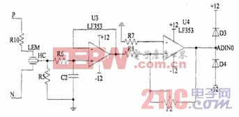 感应电机交流定子电压的监测方法有光耦直接检测法和电压传感器检测法[8]。本系统采用LEM电流霍尔测压法。(即:由霍尔元件串一个电阻,然后并联到主回路,通过MAX197检测霍尔的电流大小来间接的反映直流侧电压)。其信号处理电路如图3.3。