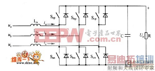 假设三相输人交流电压平衡对称,输入电压及电流均为正弦,每相的输人电感La、Lb、Lc的寄生电阻,以及相应开关管的通态电阻分别用Ra、Rb、Rc表示。