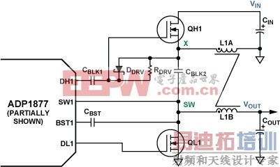 图4显示完全同步反相SEPIC配置的功率级,它利用ADP1877实现,只需要三个小型、廉价的额外器件(CBLK1、DDRV和RDRV),其功耗可以忽略不计。