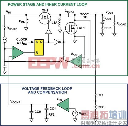 图6显示同步反相SEPIC降压/升压拓扑结构中ADP1877反馈环路的等效电路。上框包含功率级和电流环路,下框包含电压反馈环路和补偿电路。
