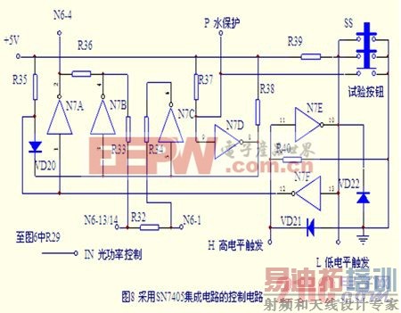 操作控制电路如图8所示。该电路仅采用一块SN7405六反相器集成电路,就可以制作出激光电源操作控制电路,凸显出环节的简捷精炼。