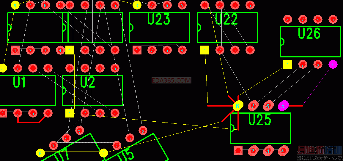 我估计是因为8脚的网络中,焊盘多,所以可以弄出图中的样子,5脚网络中只有2个焊盘,所以只能画出一条线。