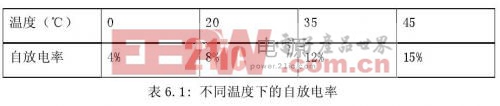 对于不同类型的电池,自放电速度是不一样的。而且,不同类型的电池,影响自放电的主要因素也不完全一样。影响自放电的因素,有温度、电池的剩余电量等。当温度愈{,SOC愈大,自放电程度越深。电池厂商给出的参数说明,在充电较满的状态下,前3天电池的自放电最严重。而且,自放电随温度不同也有较大差别。表6.1给出不同温度下搁置3天电池自放电率。