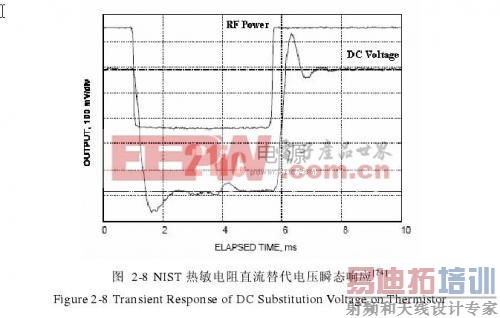 1)过程1:高频和微波功率进入功率座,由于热敏电阻的热容极小,直流平衡电桥的时间常数很小,如图2-8所示,用于美国NIST的N型同轴热敏电阻功率座对高频和微波功率输入的响应平衡时间小于6ms.在如此短的时间内其他因素的影响可以忽略不计,平衡电桥在很短时间内达到重新平衡,平衡时PRFsub =Psub,ηteff =ηeff =ηs。