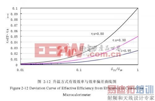其中从低到高依次是效率ηs为0.95、0.9、0.8时有效效率与效率的偏差随G21/G10变化的曲线,由图2-12可见采用升温方法测量的有效效率总是大于效率,对ηs较小的功率座,两者差异较大;对同一个功率座,ηs和G21固定,G10是影响二者差异的原因。