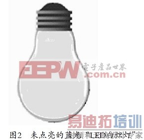 蓝光“LED白炽灯”由于采用黄磷染色或喷涂黄磷的PVC灯罩,因此在未点亮时灯泡呈黄磷的黄色,当其上电点亮后发出冷白或暖白的白光。未点亮的蓝光“LED白炽灯”如图2所示。黄磷染色或喷涂黄磷的PVC灯罩是关键技术。