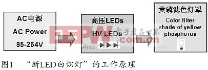 蓝光“LED白炽灯”沿用白炽灯的结构设计是为了方便传承百年来白炽灯的使用习惯,创新其内涵是赋予LED节能、无公害、长寿命的新技术。以蓝光HV LEDs为光源,加上黄磷滤色灯罩。市电经AC/DC整流和恒流驱动电源变换,输出恒流直流电点亮蓝光LED光源,蓝光经黄磷滤色灯罩的过滤二次发光,使“LED白炽灯”发出冷白光或暖白光。工作原理如图1所示。