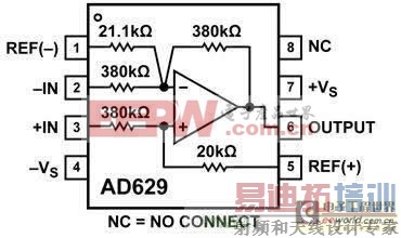 其次,AD629应仅采用内部匹配薄膜电阻在单位增益模式下工作。若使用外部电阻来更改增益,则会因失配误差而导致共模抑制性能下降。