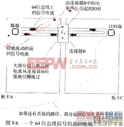 图9.6举例说明了一个普通的电磁干扰问题。一个64位总线从板卡A经过连接器B连到母板卡上,母板卡可能是一个主CPU卡或是一个通往其他子卡的无源通道。64条信号线的返回电流从母板卡C流回板卡A,其中的绝大部分通过了连接器B的接地脚。