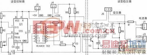 ③逆变稳压器选择带中心抽头变压器的逆变电路如下图右侧电路所示。交替驱动两个功率BJT(V1、V2),经变压器耦合给负载加上矩形波交流电压。两个二极管(D1、D2)的作用也是提供无功能量的反馈通道。该电路优点是控制电路简单,元件保护技术成熟。逆变开关元件选择功率BJT管是因其价格便宜,控制灵活。