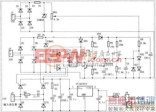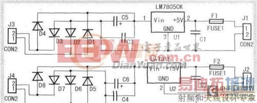由于555(U1)和JK(JP1)触发器是有源器件,因此还需另外制作5V和15V直流稳压电路如下图所示,做为其偏置直流电压源,15V稳压电源还为两个功放管(V3、V4)提供偏置电压。