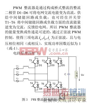 3.1 MATLAB 故障仿真与分析选取 PWM 整流器电路作为诊断实例,原理图如图 3 所示, 使用 MATLAB 进行建模与仿真,电路参数设置如下:输入三相交流电压为380V,工作频率为 50Hz,电阻为 0.1Ω ,电感为 1mH,载波频率为 10000Hz,调制系数为 0.4,通过 MATLAB 分别对PWM 整流器正常工作和开关管故障时进行仿真,仿真时间设为 0.2s,在 0.1s 时发生开关管开路故障,下面我们通过提取小波能量谱来作为神经网络训练样本,然后在 0.12s、 0.08s 等时刻再次提取故障特征, 以此来对神经网络进行测试,从而完成对开关管故障的诊断和诊断算法的验证,为了问题的简化与说明,下面我们只对开关管单管故障进行举例,其他情况依此类推。PWM 整流器基本工作原理[1]: