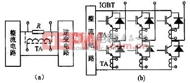 (1)驱动电路中无保护功能。这时在主电路中要设置过流检测器件。对于小容量变频器,一般是把电阻R直接串接在主电路中,如图1(a)所示,通过电阻两端的电压来反映电流的大小;对于大中容量变频器,因电流大,需用电流互感器TA(如霍尔传感器等)。电流互感器所接位置:一是像串电阻那样串接在主回路中,如图1(a)中的虚线所示;二是串接在每个IGBT上,如图1(b)所示。前者只用一个电流互感器检测流过IGBT的总电流,经济简单,但检测精度较差;后者直接反映每个IGBT的电流,测量精度高,但需6个电流互感器。过电流检测出来的电流信号,经光耦管向控制电路输出封锁信号,从而关断IGBT的触发,实现过流保护。