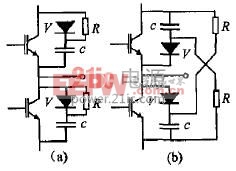 (2)采用吸收回路。吸收回路的作用是;当IGBT关断时,吸收电感中释放的能量,以降低关断过电压。常用的吸收回路有两种,如图4所示。其中(a)图为充放电吸收回路,(b)图为钳位式吸收回路。对于电路中元件的选用,在实际工作中,电容c选用高频低感圈绕聚乙烯或聚丙烯电容,也可选用陶瓷电容,容量为2 F左右。电容量选得大一些,对浪涌尖峰电压的抑制好一些,但过大会受到放电时间的限制。电阻R选用氧化膜无感电阻,其阻值的确定要满足放电时间明显小于主电路开关周期的要求,可按R≤T/6C计算,T为主电路的开关周期。二极管V应选用正向过渡电压低、逆向恢复时间短的软特性缓冲二极管。