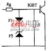 除了上述减少c、e之间的过电压之外,为防止栅极电荷积累、栅源电压出现尖峰损坏IGBT,可在g、e之间设置一些保护元件,电路如图5所示。电阻R的作用是使栅极积累电荷泄放,其阻值可取4.7kΩ;两个反向串联的稳压二极管V1、V2。是为了防止栅源电压尖峰损坏IGBT。