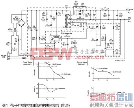 采用以实验为依据的试错法来实现控制环路稳定不仅耗时,而且还容易出错。因为这种方法很难设想到并测试电源在其生命周期内将会遇到的每一种工作条件。反馈电路的设计令人生畏,但可以采用零极点配置、系统传递函数和基本线性控制理论等概念轻松地设计出稳定的控制环路。本文将向您介绍如何基于Power Integrations带PWM控制的TOPSwitch系列IC通过九个步骤设计出稳定的电压模式反馈电路(典型电路如下面图1所示)。请注意,PWM控制与Power Integrations许多其产品系列所采用的开/关控制方案截然不同。开/关控制的迟滞性可以实现非常稳定的性能,通常不需要进行额外的环路稳定。
