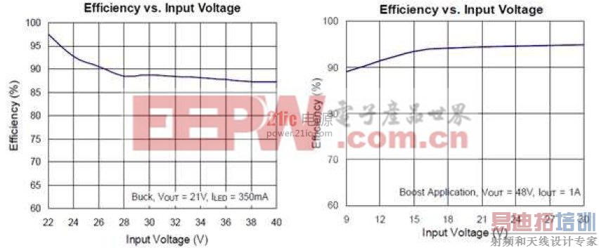 例如60V的adaptor,LED最多串到15,16颗,如果要设计20W的灯条,就需要使用较大电流的LED.此种结构,为了使效率达到最高,要让输入电压尽可能接近输出电压。也就是说,必需针对LED的数目来调整输入电压,或是adaptor的输出电压。以10棵LED为例,如果要达到最高效率,就必须把输入电压调到约40V左右。而让降压的效率达到96%以上。而如果调整LED数目不相对调整输入电压,会对效率造成明显的影响。[p]