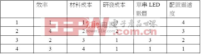 根据上面的分析,列出统计表如下,1为最好,4为最差。可以看出4种架构,在不同的地方,各有其优缺点,应该能满足大多数路灯或高功率灯具的设计需求。第一种方式,虽然有机会达到最高的效率。但受限于目前高功率LED不分BIN的影响,较难普及,但随着LED生产制程的改善,Vf的分布会日渐集中。而当高功率LED的产量,达到分BIN的经济规模时,这种架构应该是最适合的。