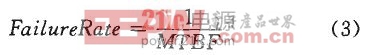 举一个例子,一个1 000个产品的样本群体每天产生24 000小时的时间总和。如果这个群体在1个月的工作中有4个故障,则这个产品的MTBF为(1 000单位×24小时/天×30天)/4,即180 000小时。再提供另外一个例子,如果产品的MTBF为300 000小时,这些产品很可能在1 000个同时工作时,平均每过300小时,会有一个失效。这些产品个数为10 000,则可以预见平均每30小时会有一个失效。必须明确,具有300 000小时MTBF的产品并不意味着任何特定的产品将可望有30万小时的寿命。还有另一种方式来理解可靠性,是看它的失效率。公式(3)表明,失效率仅仅是对MTBF的倒数。
