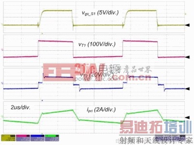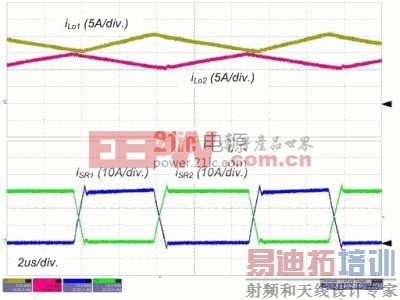 图 4 和图 5 所示为转换器在标称输入和全负载情况下的实验波形。S1 的栅极信号,主变压器的初级端和次级端的电压和初级端电流如图4所示。请留意这些波形与理论分析很好地吻合,包括ZVS 运作。输出电感电流和 SR 的电流如图 5 所示,由于占空比和寄生组件,输出电感电流是不均衡的,这意味着平均励磁电流小于中心抽头式配置(注 1)。