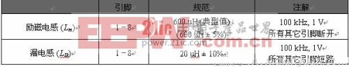 图 3 所示为参考设计的完整原理图,变压器的电气特性如表 1 所示。