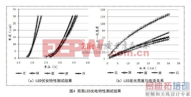 应用上述电路,设计了简易的LED光电特性测试装置,并用一些红、绿、黄、蓝、白等各色LED进行了测试,结果如图4.图4(a)为不同颜色LED的伏安特性曲线,图4(b)为不同颜色LED的发光亮度与电流的关系。从图中可以看出,LED电流随电压变化很快,而发光亮度与电流基本上是线性关系。这可以作为设计LED驱动电路的参考依据。另外,用Keithley2612高精度源表对伏安特性进行了校准,用照度计对亮度测试进行了校准。实验结果表明,通过硬件调整和软件补偿,结果误差可以控制在5%以内,达到实用目标。
