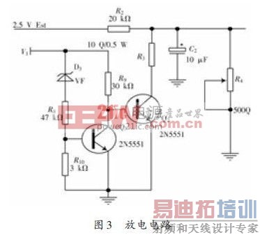 如图3所示,为掉电快速放电电路4增加稳压管D3的电路原理图,当模拟恒流负载电路接入端L1,L2的输入电压V1 降低到一定值后(即当R10 (R8 ) + R10 ·(V1-VF)0.6 V 时,V110 V+VF),三极管Q3 关断,三极管Q2 导通,电容C2 通过电阻R3 快速放电,通过稳压管D3 可以改变将本文设计的缓启动恒流电子负载的线路板及功率器件封装成大功率电阻的形状,就构成带有极性的负载(V+,V-),该电子负载可以并联和串联使用,反接无效.可以根据需求设计成不同电流和功率的负载,方便负载的串并组合.