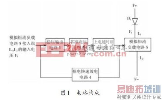 如图1.图2所示,带缓启动的恒流电子负载包括负载接入端子V+,V-.稳压输出电路1.基准电压电路2.上电延时启动电路3.掉电快速放电电路4.模拟恒流负载电路5和防止极性接反的二极管D1,负载接入端子V+V-输入电压,经稳压输出电路1 提供稳压输出+VCC,经基准电压电路2提供稳定的2.5 V 基准电压,再经上电延时启动电路3控制模拟恒流负载电路5,使负载电流能从0 mA缓慢上升至额定电流,再配合掉电快速放电电路4,保证了断电后上电再启动的延时效果.