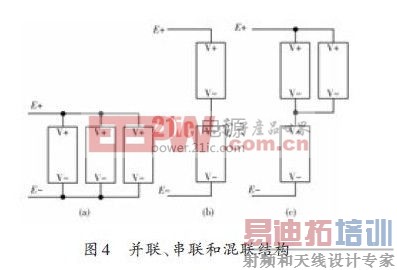 如图4所示,其中(a)为并联结构,(b)为串联结构,(c)为混合结构,E+,E-为LED电源输出电压的正负端.
