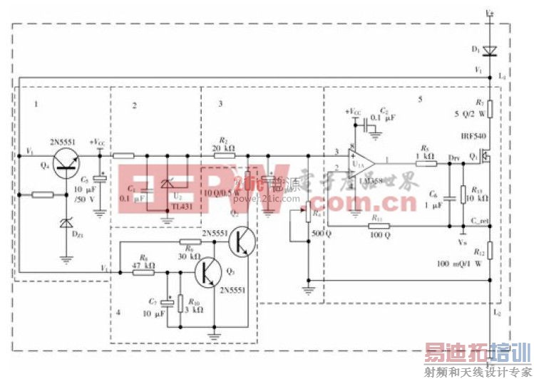 掉电快速放电电路4包含电阻R3,R8,R9,R10.电容C7和NPN 三极管Q2,Q3.当模拟恒流负载电路5 接入端L1,L2 的输入电压V1 降低到一定值后( 即当R10 /(R8 + R10 )·V10.6 V时, V110 V),三极管Q3关断,三极管Q2导通,电容C2通过电阻R3快速放电,确保再次上电启动瞬间,电容C2上的电压为零,从而保证上电再启动时的延时效果.电容C7的作用是上电瞬间,使三极管Q3 截止,三极管Q2 导通,确保电容C2 维持低电压,以增强上电启动的延时作用,使软缓启动的功能得以进一步加强.