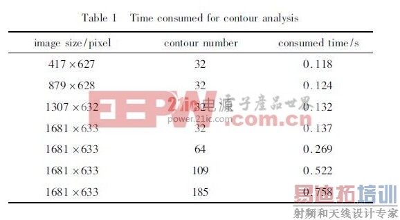 为了测试该算法的性能,选择了不同尺寸和不同轮廓数目的LCD 线路图像,对每张图像进行50 次重复测试统计轮廓分析时间,其图像尺寸。轮廓数目以及轮廓分析平均消耗时间的关系如表1 所示。所用PC 配置Intel Core2 Duo T6670,2. 2GHz 处理器,2GB 内存,Windows7 系统,并在VS2008 开发环境下进行试验。