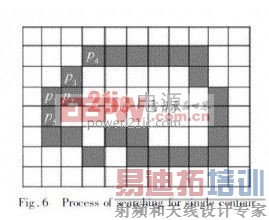 当得到一个轮廓的所有像素之后,就能很方便地计算其特征参量,比如周长。面积。质心等。由图6 可以看出,轮廓的周长即是该轮廓所包含的像素个数,因此可以很方便地计算出来; 质心可由质心公式计算,对于图像即是所有像素的坐标平均值。