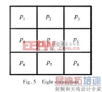 首先定义一个Contour 对象contour,假定从P1开始搜索,由于LCD 线路主要走向是横向,因此先搜索P1的左右像素,再搜索上下像素,最后搜索4 个角的像素; 当搜索到一个连通像素P2后,根据深度优先策略,停止对P1邻域的搜索,即使P1还可能有其它连通像素,例如这里的P5和P3,将P1存入contour,并将P1标记为已搜索; 然后以P2为中心搜索,虽然P1与P2连通,但标记为已搜索,因此,将搜索到P2的连通像素P3; 再以P3为中心搜索到P4,如此进行下去。当搜索到P5时,发现与其连通的像素均已标记为已搜索,于是对该轮廓的搜索结束。可见,对一个轮廓搜索结束的条件为: 某一像素的所有连通像素均标记为已搜索。[p]