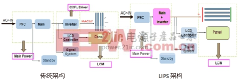 这是对传统架构的一个革命,它将电源板和逆变器集成到了一起,逆变器输入不再采用电源板的24V电压,而是直接取自PFC后的400V输出。通过这种方式,背光部分的电能减少了一级能量转换,同样也节省了一级效率损耗,这使得电源板设计功率可以大幅降低,同时也解决了电源板的散热问题,最重要的是使得制造成本大幅降低。另外为了改善CCFL的负电阻特性,使CCFL能够并联驱动,电路还加入了电容平衡板或电感平衡板,使得逆变器的变压器使用数量大幅减少,这也使得制造成本进一步得到了降低。