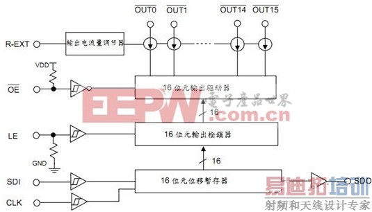 需要说明的是,以上仅以16颗 LED作为例子,实际应用中会级联多个MBI5024芯片,即上一级MBI5024芯片的SDO连接至下一级MBI5024的SDI,当有N个 MBI5024级联的,相当于一个N*16位的移位寄存器,最多可以连接N*16颗LED的R/G/B.操作流程与上面介绍的7个步骤类似。