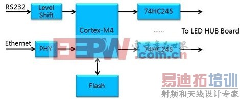特点:结构简单,但是由于没有使用FPGA,ARM Cortex-M4的实时性及速度无法满足全彩LED显示的控制要求,所以只能实现“七彩”显示,而不能实现真正意义上的全彩显示。